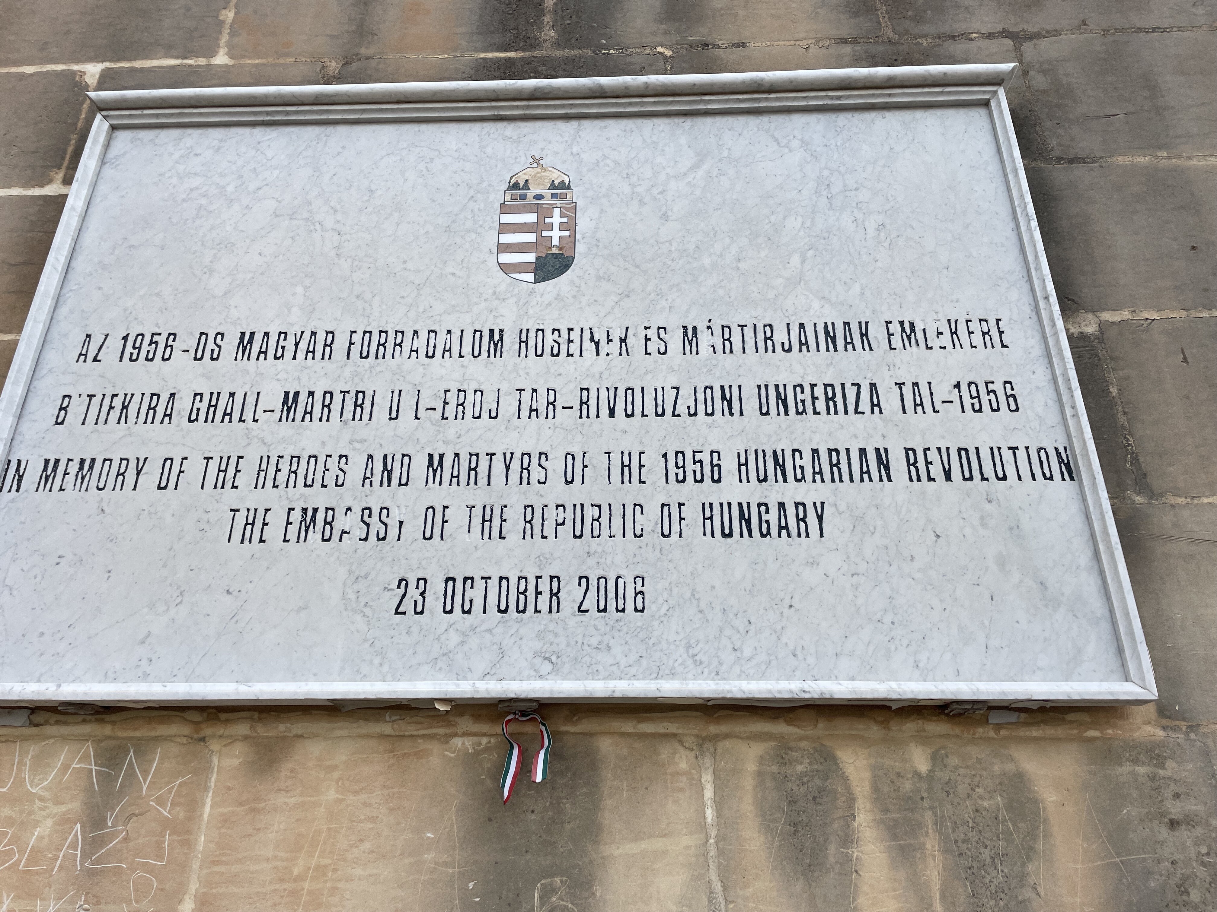 La Valetta történelmi részében, az egyik gyönyörű parkot körülölelő bástyafalon található az 56-os forradalom emlékét dicsőítő dísztábla. Jelenleg csak egy rövidke nemzeti színű szalagot lobogtat alatta a szél, amint turisták hada hömpölyög el alatta. De vannak, akik megállnak. Bár ne tették volna.